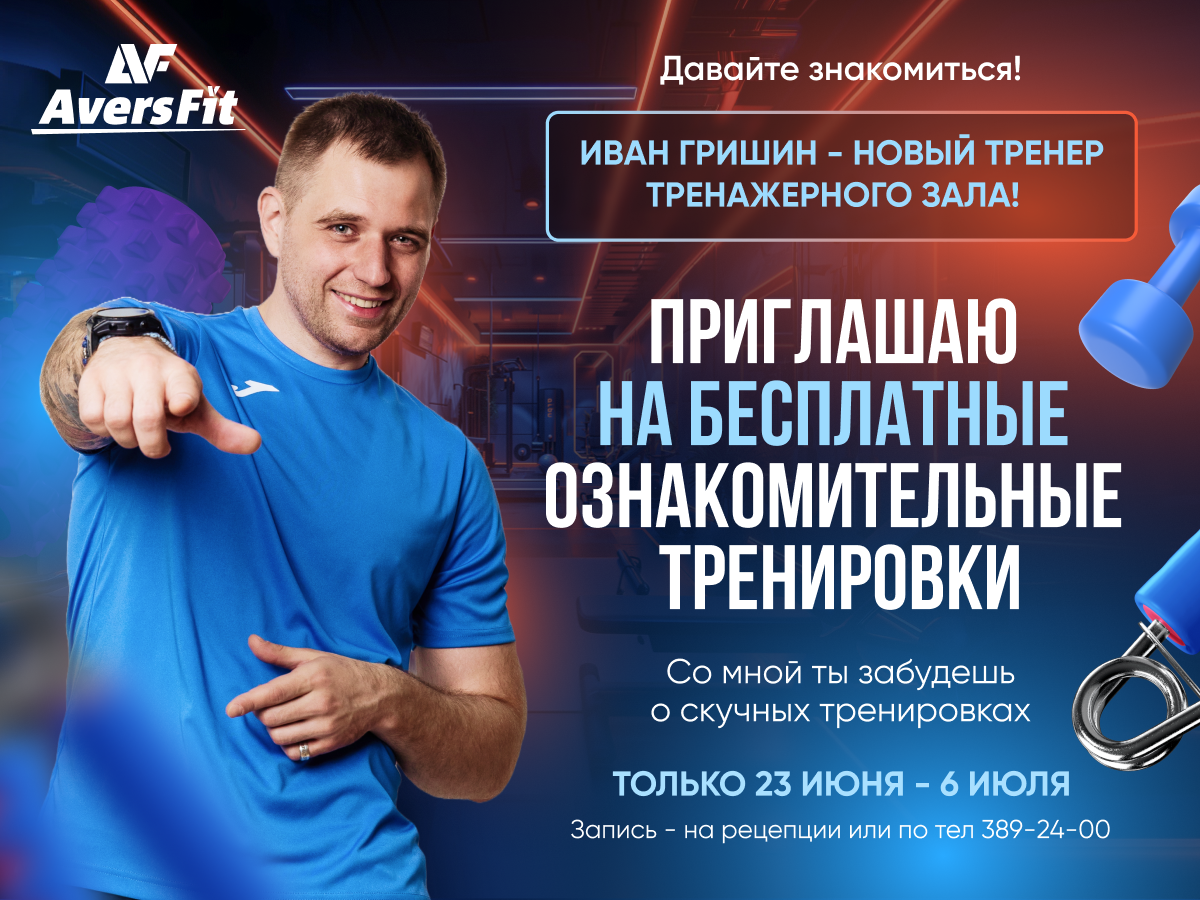 Бесплатные тренировки с Иваном 🗓️ с 23 июня по 6 июля! Записывайтесь на рецепции ✍️ или по тел 📞 389-24-00.